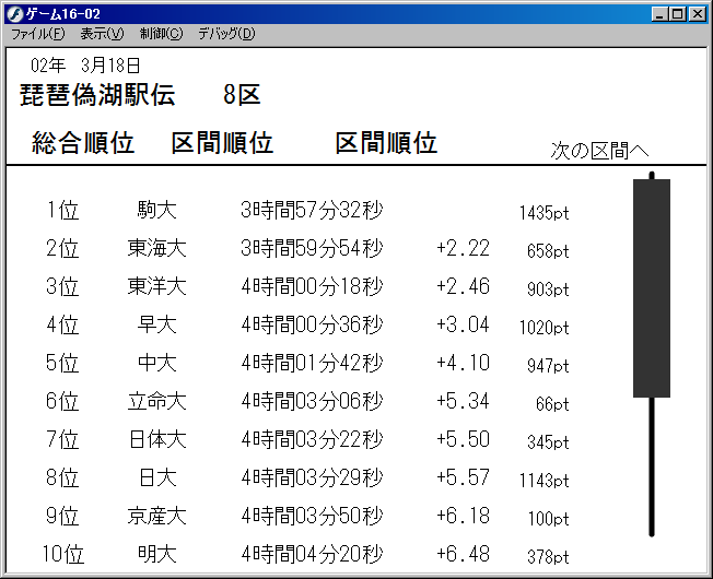 上の画像はこのタイムで通しでテストした1年最後の琵琶偽湖8区時点での表示。ptは本番でも概ねこんな感じになると思われるが、ちょっとまだここは改良はできそう。まぁここも自校の分を入れてからのテストプレイでどうなるか、だろうなぁ。ちなみにこの画像の上位校は普通に4時間を切っているけど実際のびわ湖大学駅伝の大会記録は4時間13分54秒だとか・・・。