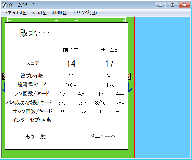 いやまぁしっかりとプログラムした通りに動いただけなんだけどさ、なんか本気で悔しくなって思わず笑いながら机叩いちゃったよ。一応面白さという点でもそれなりの出来にはなってるってことなのかねぇ。んー。ついでにこの試合はスタッツも実際のアメフトっぽくなったので結構満足してます。