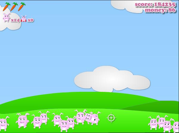 下でうろうろしてるウサギを上空に飛ばす。飛んでいる最中のウサギをクリックすると左上のニンジンの回数分だけ加速できて、この時にクリックする場所で跳び方が変わるというのがこのゲームの特徴かな。これでその時の目標に合わせてひたすら上を目指したり$や1UPウサギを狙ったりといったプレイが出来るようになっている。