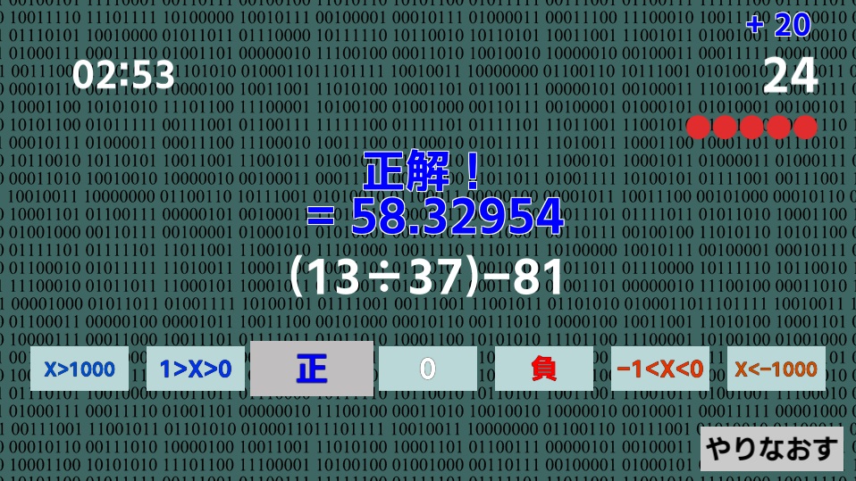 Unity製のゲームで操作はマウスクリック。表示される計算式の結果を下のボタンで選んでいく。合っていれば加点で複数正解がある場合は正/負よりもその外側のボタンの方が加点が大きくなる。お手付きを5回するとゲームオーバー、180秒の時間内で高得点を目指す。難易度は普通ぐらいで、おおざっぱに選べばいいだけなのでこの手の計算系の中でも簡単な方だと思う。ただ急ぐとお手付きもあったりするし意外としっかり頭を使う印象もあって個人的にはそこそこ楽しめました。はい。自分の最高は47450点でしたー。