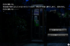 ティラノ製のゲームで操作はマウスの左クリックで決定、右クリックでメニュー、ホイールでバックログとか。ADV系の内容でテキストを読み進めるのが基本、途中の選択肢で展開が分岐する。難易度は低く、全部両方試しても15分とかで読み終わりそう。ショートショート的な読み物としては悪くはないけどゲームとして面白いかというと微妙で個人的にはあまり楽しめなかったかなぁ。あとティラノの1行ずつ表示する方式は普通に読みづらく、ページごとに一気に表示かせめてページが代わる際に違うマークを付けるとかして欲しいわ。