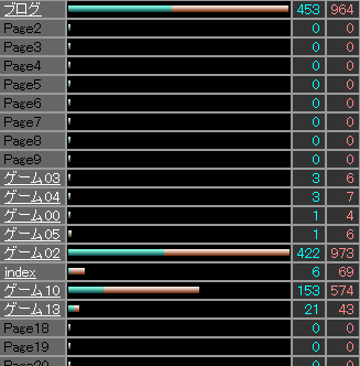 そして相変わらずほとんどアクセスのないゲーム達よ・・・。いやー、なんかホント悲しくなりますねぇ。いや確かにうちのなかでは駅伝部ゲームが面白いってのはわかるけどさすがに少なすぎるし。ブリクエ、発展と防衛辺りは自分以外まだ誰もクリアしてないんでしょうねー。はい。