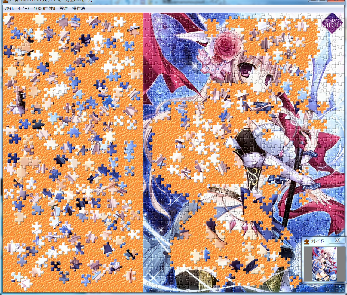 まず好きな画像を付属しているIMAGEフォルダに入れて、上部メニューからピース数、ピクセル(完成図の大きさ)、回転と裏返しを設定し、上部メニューにあるファイルの「開く」からその画像をダブルクリックするとスタート。以降はピースをマウスドラッグで移動して合うようにはめ込み、最終的に全て揃えればクリア。また「回転あり」にした場合は左右のクリックで90度回転する。上部メニューの「状態保存」や、「終了時状態保存」にチェックを入れることでセーブも出来たりする。