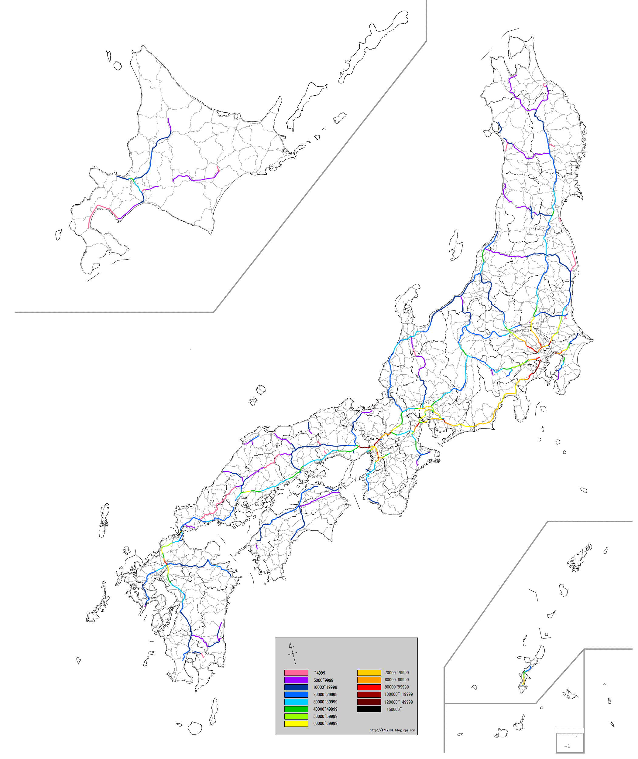 なんか思いついたので作ってみた。制作時間約10時間。ドイツのアウトバーン関連の総合サイト、AutobahnatlasにあるVerkehrsmengenkarteのパクリです。
