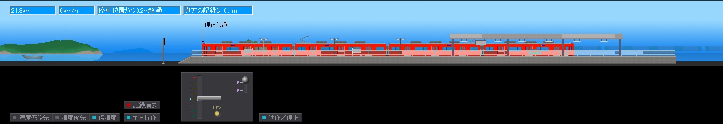 おぱく堂のキットを使ったゲームで、まず右下の動作/停止をクリックして開始。以降は中央のレバーにマウスカーソルを当てて下に動かすと加速、上に動かすと減速となり、速度を調整して駅の停車位置に合わせて止めるのが目的。制限時間等は無く、同じ区間を繰り返し運転する構成になっている。