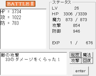 操作はマウスクリックで、最初はenterでテキスト送り、以降の戦闘では4つのボタンでコマンドを選んで実行する。自分と相手が交互に行動し、先に相手のHPをゼロにすれば勝利でEXPを入手。このEXPが一定の値に達するとレベルアップで能力上昇の他HPと魔力が全回復する。自分のHPがゼロになるとゲームオーバー、その時点での戦歴で評価が表示されたりする。