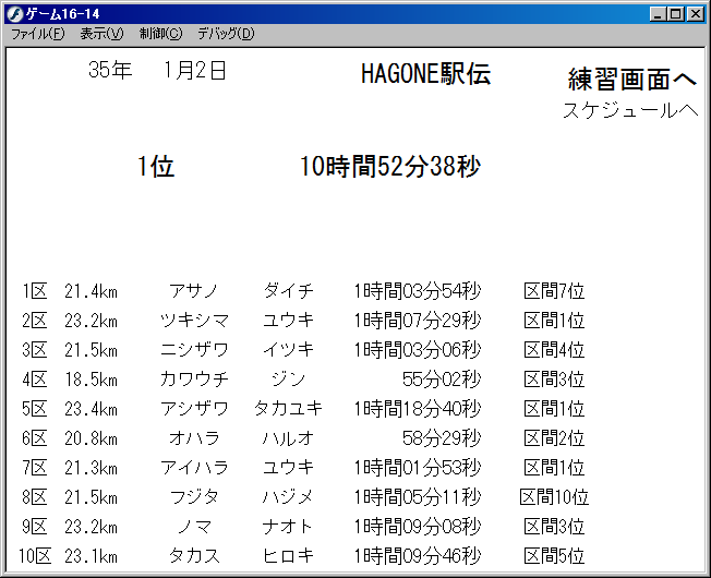 あと細かい部分。名前は苗字が前作より50種類増えて450種類。今回は1~3番手の重要度が増したためそこに同じ苗字が被らないような工夫もしてみた。名前は前作から減って200通りの170種類。今回もアニメキャラと実在の陸上選手から持ってきた。まぁ無難な感じになったとは思う。保守的すぎる気はしないでも無い。
