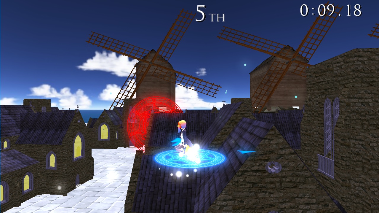 操作はエンターキーで開始、スペースキーで加速、矢印キーで旋回、shiftキーでドリフト、Escキーでタイトルに戻る。3Dのレース系ゲームで、魔法陣で▲2つで表示されている方向にある赤いチェックポイントをくぐっていく。最後のチェックポイントにたどり着けばゴールとなる。