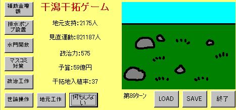 マスコミや地元に対する政治的工作を行って抵抗勢力を抑えつつ干拓工事を行う。バランスはまぁまぁかな。使いどころがよくわからないコマンドもあったけど、入植達成エンドはセーブしながらのプレイならちょうどいいぐらいの難易度だと思った。READ ME内にヒントもあるし。