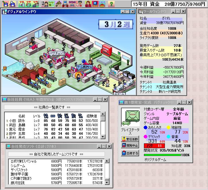 雇った社員を机に配置してゲームを作っていく。ゲーム制作はほとんど自動で行われる。制作中の数値が溜まっていくのは分かりやすく、完成後もバグ取りが必要だったりとゲームが出来るまでの一連の流れ作業が面白い。始めのうちはクソゲー賞取ったりとなかなか上手くいかないけど、軌道に乗ったときがすごく楽しいのはさすがカイロソフトといった感じ。
