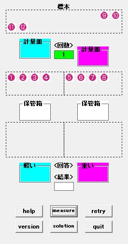 操作はマウスクリックで決定、ドラッグで標本(数字の描いてある丸)を皿に載せたりする。まず標本数を決めて開始、計量皿に標本を乗せてmeasureボタンを押すと左右の重さが同じなら釣り合ったまま、違う場合は傾く。何回か計量を行い重さが違う標本が何番か、他のものより重いか軽いかを推理し、最終的に回答欄にそれをドラッグするのが目的となっている。