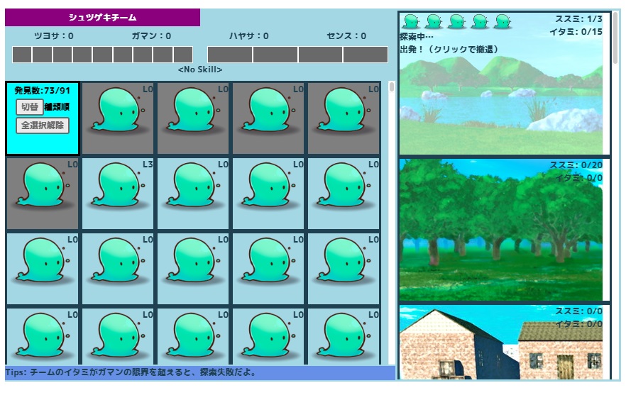 操作はマウスクリック。一覧から魔物を選んでパーティーを組み、右にあるダンジョンに向かう。ダンジョン内では自動で探索が行われ、ススミの値が規定値に達するとクリア、またクリックすることで任意のタイミングで帰還も可。一定の確率か特定の条件を満たすことで倒した魔物を連れ帰ったりする。イタミの値が最大値に達すると全滅で魔物がロストしたりする。ダンジョンをクリアすることで新たなダンジョンが見つかったりするほか多くの魔物を発見するのがたぶん目的なんだと思う。