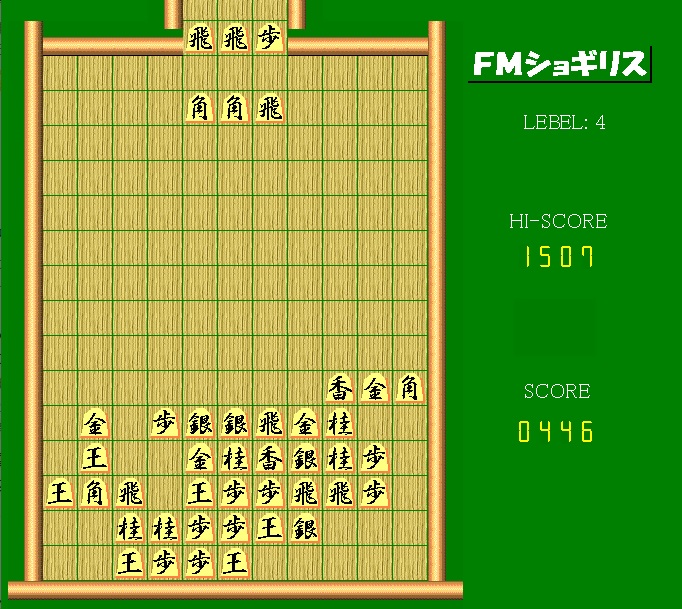 操作は左右と下キーで移動、上キーで反時計回りに回転。いわゆる落ち物系ゲームで3つ繋がりの将棋の駒を落としていく。同じ種類の駒が3つ以上それぞれの利きがつながる状態になるとそれらが消えて加点、さらに爆弾が落ちてきてその周辺にある駒も消える。上まで積み上がるとゲームオーバーとなる。