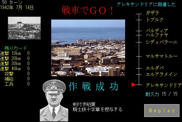 操作はマウスクリックでシナリオを選んで開始。1人用のカードゲーム風のゲームでランダムに配られた手札から進撃〇kmのカードを選んで進むのが基本。途中には妨害要素もあってそれに対応するカードを出すまで進めなかったりする。手札は3枚固定で毎ターン2枚ドロー、余った分は捨てる。最終的に50ターン以内に目的地に到着すればクリアとなる。