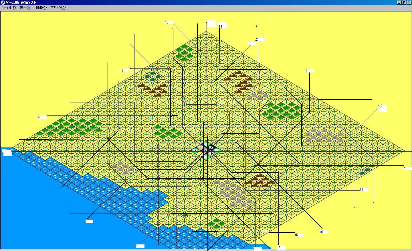 前回の問題はDとEの併用みたいな感じで決着。敵が動けるルートを絞って敵の座標を歩数で定義することにした。画像がそのルート図ね。これにより敵の範囲攻撃は廃止。ついでに味方の自由に移動できる兵器も廃止。敵の飛び道具は10歩分先のマスを攻撃する等で対応。味方の範囲攻撃は残したけど、攻撃を作る際に使ったfor文に対するbreakの位置が1行違ってたせいで1時間ぐらい詰まった・・・。今のところこれが今回の制作で一番のミスか。こんな感じでいろいろ削ったので防衛部分は味気ない感じになりそうだけど、まぁその辺が自分の限界ってことで。